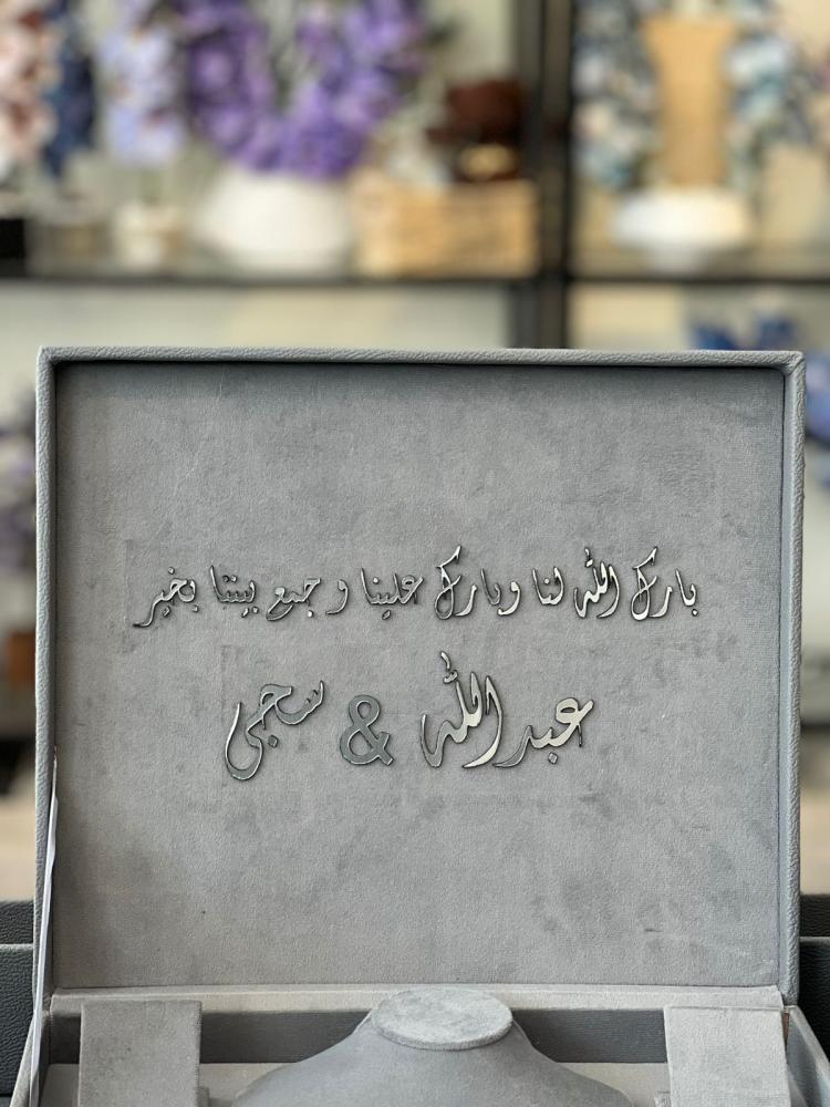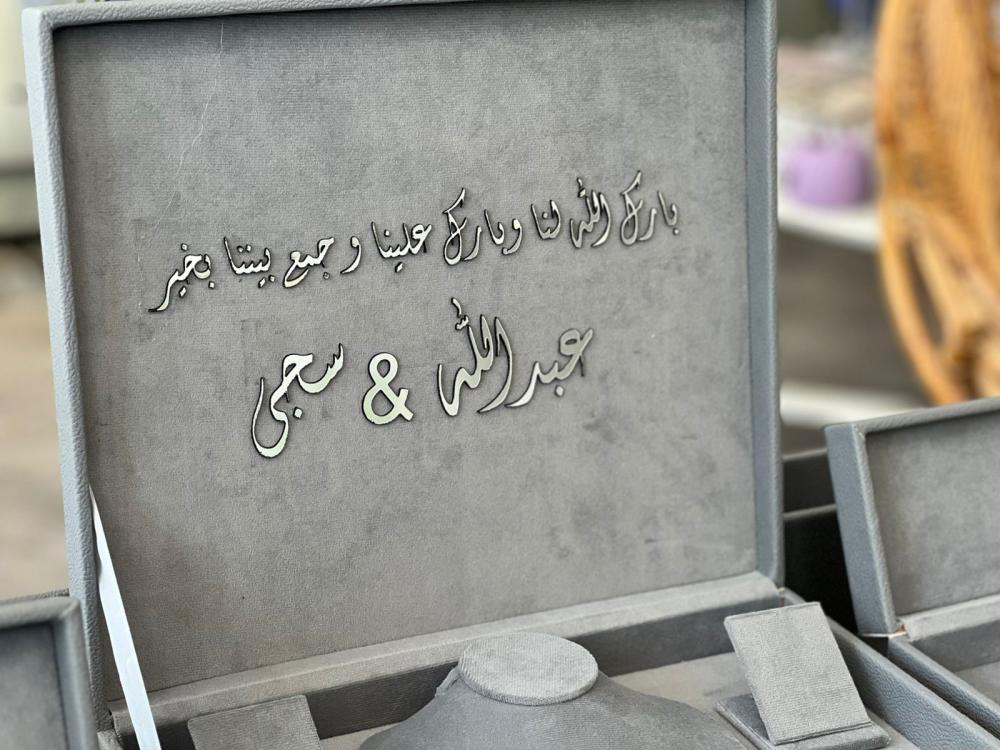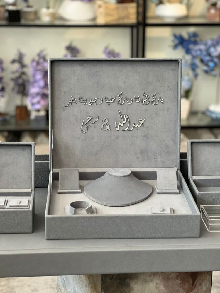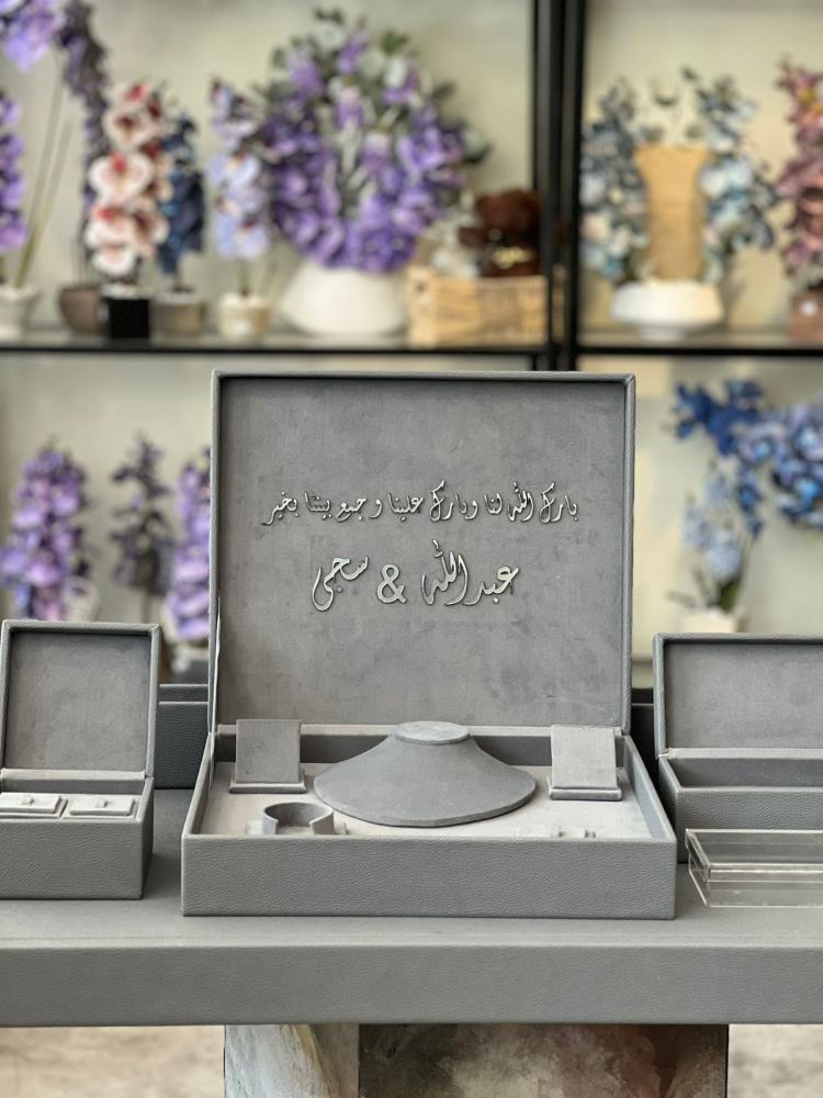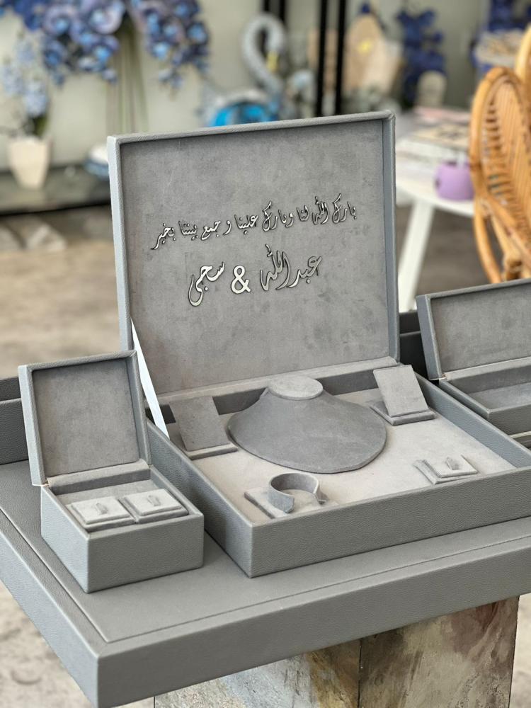 • بوكس طقم العروس: بحجم أنيق وتصميم راقٍ، يتوسطه كتابة أسماء العروسين بخط الأكريليك الفضي اللامع