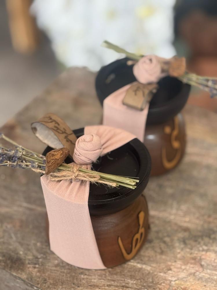 “✨ مبخرة خشب مزينة بـ لافندر طبيعي ومعها كسرة بخور كمبودي بريحة فخمة. مغلفة بقماش وعليها عبارة تهنئة بالشهر الفضيل. هدية راقية تناسب هدايا أحبابك وتضيف لمسة مميزة في رمضان.”